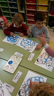 Esta semana estamos preparando el mural de los esquimales, los niños/as han hecho un iglú por equipos usando distintas técnicas plásticas y han pintado su propio esquimal.